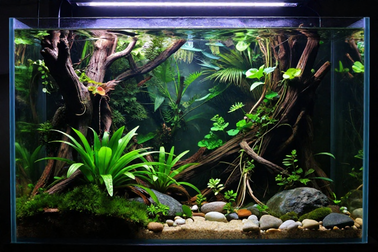 Jungle style embraces controlled chaos, as championed by YouTuber MD Fish Tanks. Your 22 lbs rocks + 1-2 pieces wood of Driftwood + River Rocks gets buried under growth anyway—focus on creating height variation for plant layering.