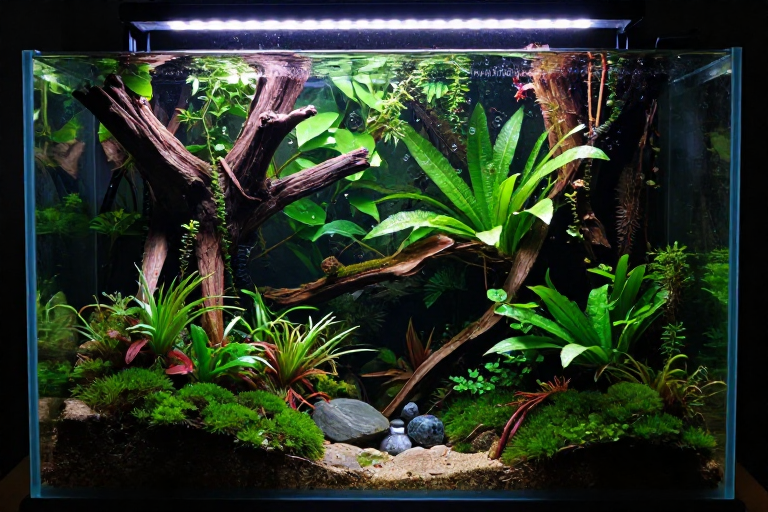 Jungle style embraces controlled chaos, as championed by YouTuber MD Fish Tanks. Your 3 lbs rocks + 1-2 pieces wood of Driftwood + River Rocks gets buried under growth anyway—focus on creating height variation for plant layering.